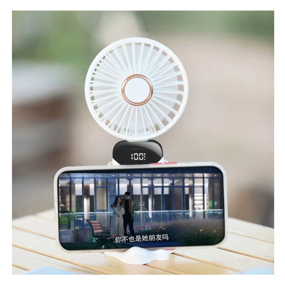 This compact and multifunctional mini fan is your perfect companion for hot days. It combines 5 wind speeds, a foldable design, neck-hanging option, a phone stand, and a smart display — all in one portable device.